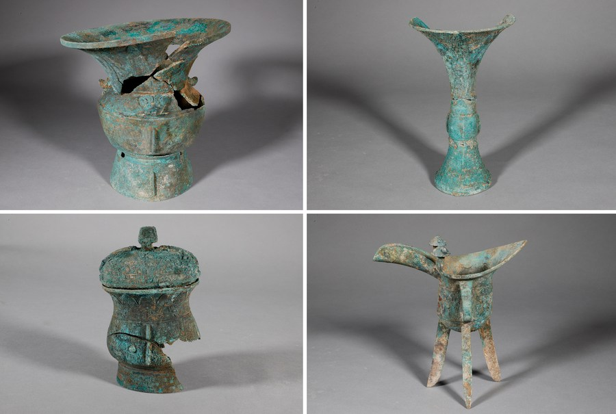 This combo photo shows bronze wares unearthed from the royal tomb area and surrounding relics in the Yin Ruins dating back to the Shang Dynasty (1600-1046 B.C.), in the northwest suburbs of Anyang, central China's Henan Province. (Xinhua/Li He)