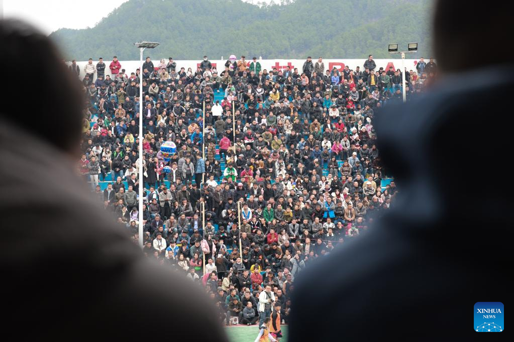 People gather prior to a basketball game between Team Tongren and Team Qiandongnan held in Taipan village, Taijiang county, Southwest China's Guizhou province, March 25, 2023. "Village Basketball Association" or "Village BA", is a grassroot basketball tournament held in Taipan village. Organized by local residents, this event has gained popularity over the years and draws a large crowd of spectators and participants alike. The tournament showcases the passion and skills of basketball players from rural areas, as they compete and demonstrate their teamwork on the court. [Photo/Xinhua]