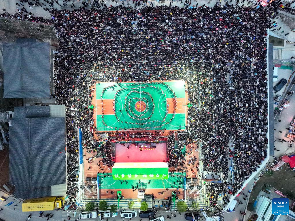 An areial photo taken on March 26, 2023 shows the basketball court prior to the third-place match between Team Tongren and Team Bijie in Taipan village, Taijiang county, Southwest China's Guizhou province. "Village Basketball Association" or "Village BA", is a grassroot basketball tournament held in Taipan village. Organized by local residents, this event has gained popularity over the years and draws a large crowd of spectators and participants alike. The tournament showcases the passion and skills of basketball players from rural areas, as they compete and demonstrate their teamwork on the court. [Photo/Xinhua]