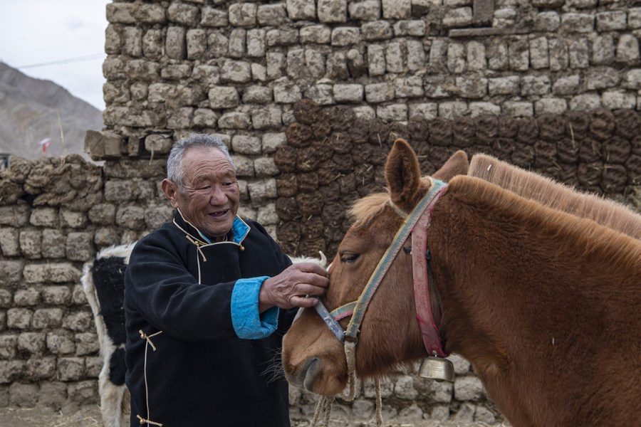 Norbu Tsering feeds a horse at home in Gyangze County in Xigaze, southwest China's Tibet Autonomous Region, March 20, 2023. (Xinhua/Sun Fei)