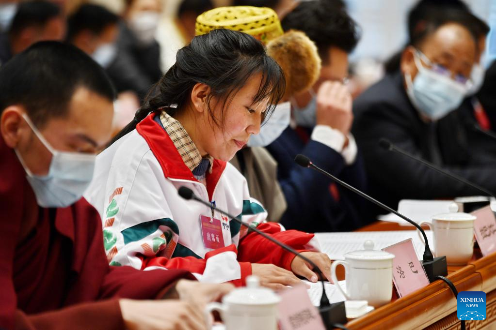 A high school student (2nd L) speaks during a symposium marking the 15th Serfs' Emancipation Day in southwest China's Tibet Autonomous Region, March 28, 2023. The 15th Serfs' Emancipation Day falls on Tuesday. (Xinhua/Zhang Rufeng)