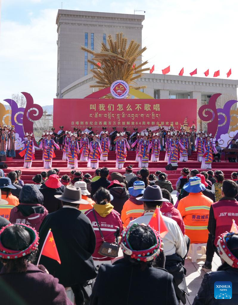 People attend a celebration for the 15th Serfs' Emancipation Day in Xigaze, southwest China's Tibet Autonomous Region, March 28, 2023. The 15th Serfs' Emancipation Day falls on Tuesday. (Photo by He Jinlong/Xinhua)