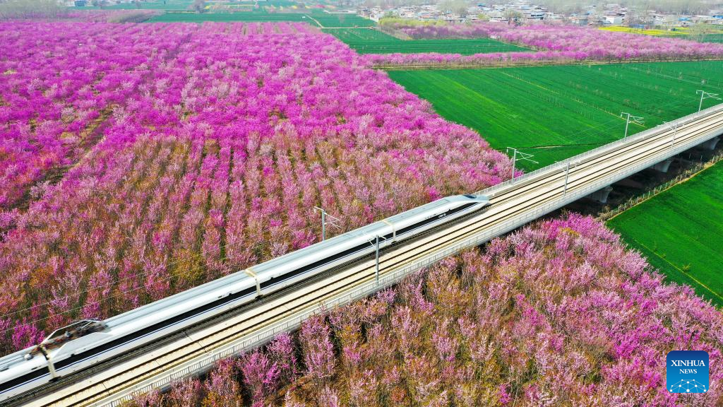 This aerial photo shows a high-speed train passing through the redbud flower fields in Xiaozhao Township of Jian'an District, Xuchang City, central China's Henan Province, March 27, 2023. Recently, about 200 mu (around 13.33 hectares) of redbud trees in Xiaozhao Township entered full bloom, attracting many tourists to enjoy the flowers. (Xinhua/Niu Shupei)