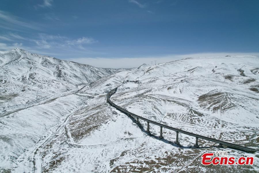 The Qinghai-Tibet railway winds along the Kunlun Mountains, amazing travelers with its appealing landscape along the plateau, in Haixi Mongolian and Tibetan Autonomous Prefecture, northwest China's Qinghai Province, March 25, 2023. (Photo: China News Service/Ma Mingyan)