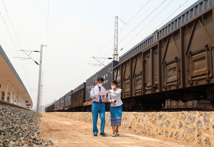 Two staff members of the China-Laos Railway inspect a freight train in Boten, Laos, April 14, 2022. (Photo by Yang Yongquan/Xinhua)