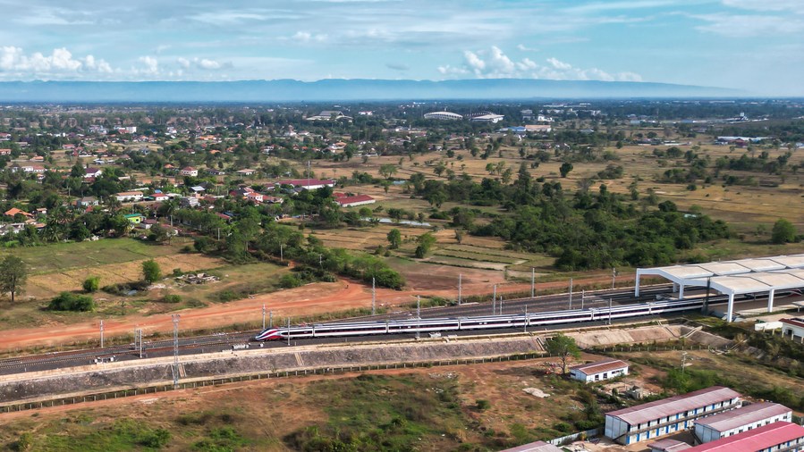 In this aerial photo, a Lane Xang EMU (electric multiple unit) train departs from the Vientiane Railway Station in Vientiane, Laos, Nov. 25, 2022. (Photo by Kaikeo Saiyasane/Xinhua)