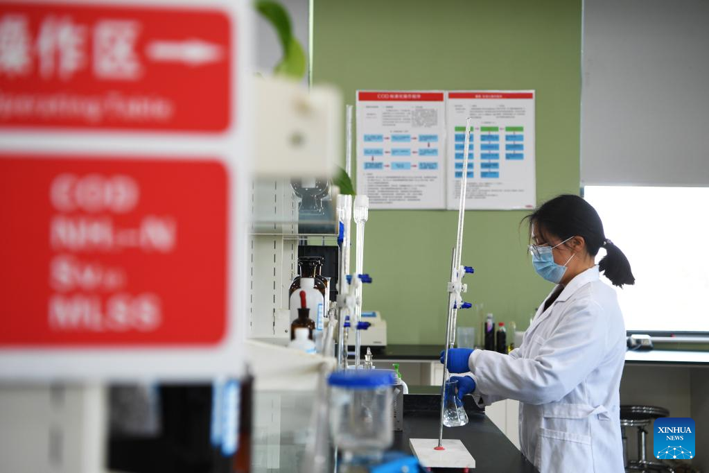 A staff member tests the quality of water at the No. 3 sewage treatment plant in Suixian County of Shangqiu, central China's Henan Province, March 28, 2023. The No. 3 sewage treatment plant of Suixian County, completed in 2018, is a new concept sewage treatment facility combining wastewater treatment, biomass power generation, scientific research, science popularization, and eco-agriculture demonstration functions. The high-standard recycled water processed by the plant has improved the water quality of the local Limin river. (Xinhua/Zhang Haoran)