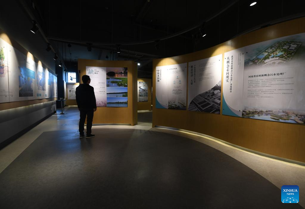 A man visits an exhibition on wastewater treatment at the No. 3 sewage treatment plant in Suixian County of Shangqiu, central China's Henan Province, March 28, 2023. The No. 3 sewage treatment plant of Suixian County, completed in 2018, is a new concept sewage treatment facility combining wastewater treatment, biomass power generation, scientific research, science popularization, and eco-agriculture demonstration functions. The high-standard recycled water processed by the plant has improved the water quality of the local Limin river. (Xinhua/Zhang Haoran)