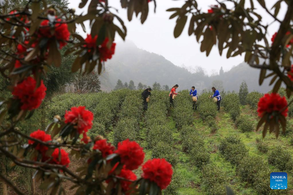 Workers harvest tea leaves in Baicha Village of Tuanba Town in Dazhu County, Dazhou, southwest China's Sichuan Province, March 28, 2023. Recently, workers are busy in harvesting and processing tea leaves ahead of the Qingming Festival to produce the Mingqian (literally "pre-Qingming") tea, which are made of the very first tea sprouts in spring and considered to be of high quality. (Xinhua/Deng Liangkui)