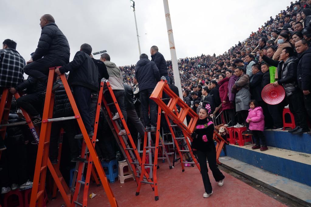 Villagers set up ladders to watch the final match between Team Qiandongnan and Team Zunyi at the "Village BA" basketball tournament in Taipan Village, Taijiang County, southwest China's Guizhou Province on March 27, 2023. (Xinhua/Li Ga)