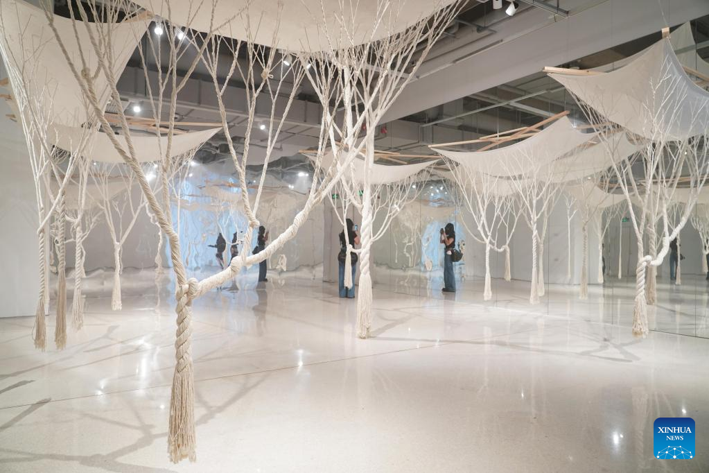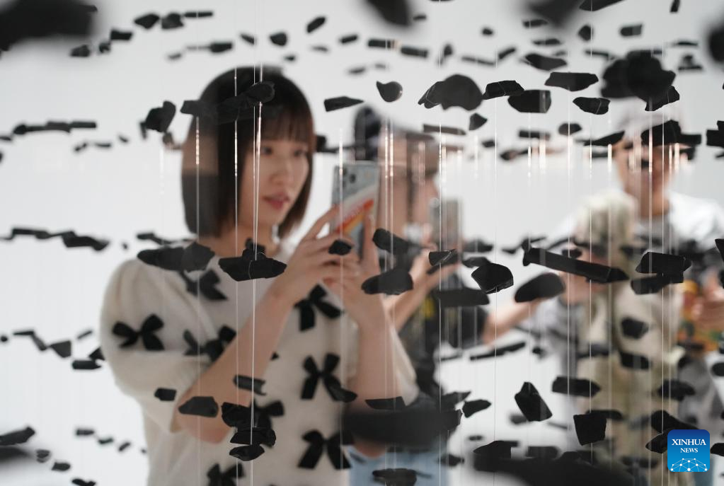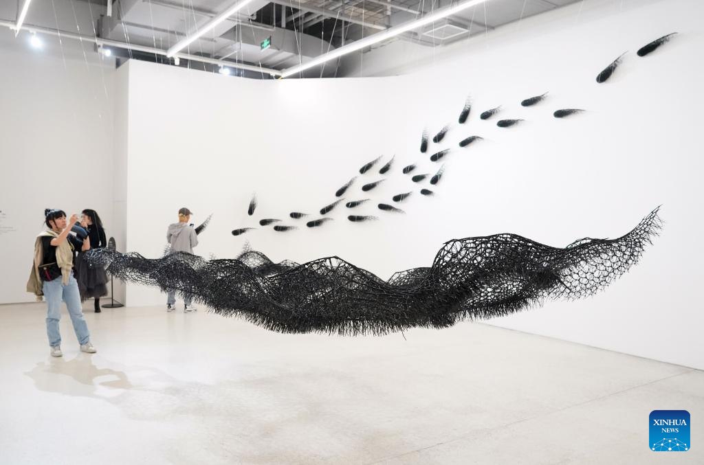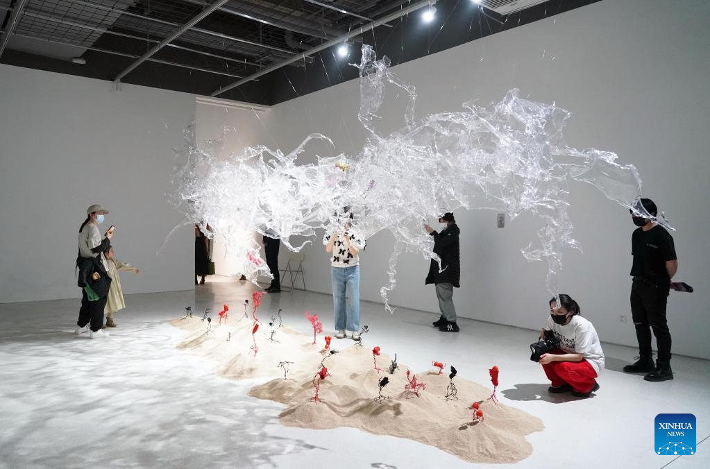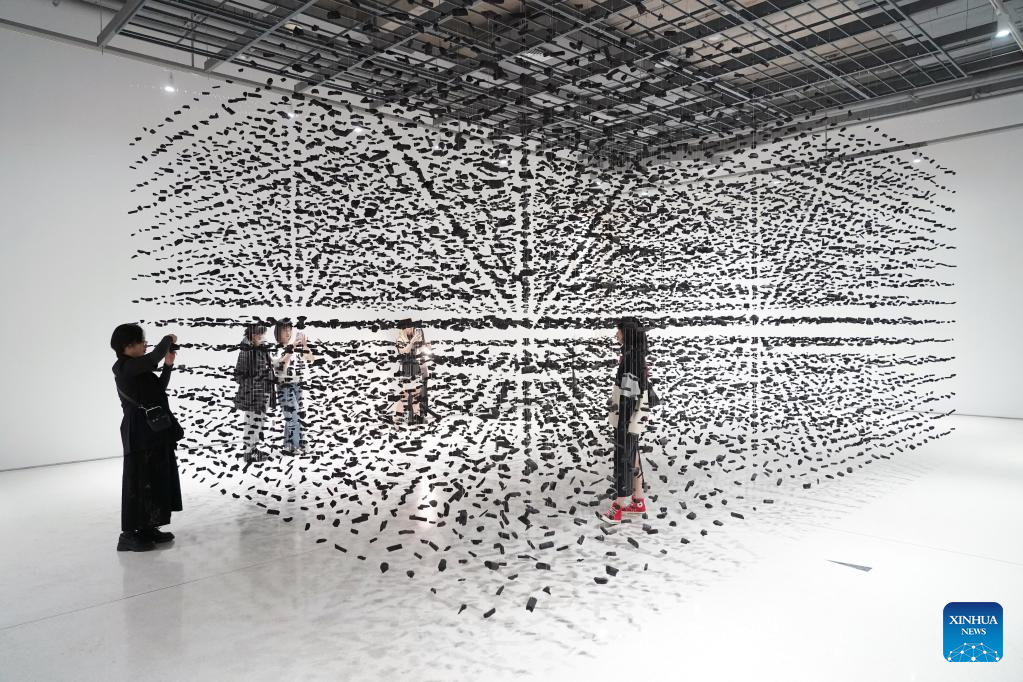 Tourists visit the contemporary art exhibition "WAVELENGTH: A Momentary Spring" at Beijing Times Art Museum in Beijing, capital of China, March 29, 2023. The event kicked off here on Wednesday, displaying contemporary art installations from 16 international artists. It will last until July 1. (Xinhua/Ren Chao)