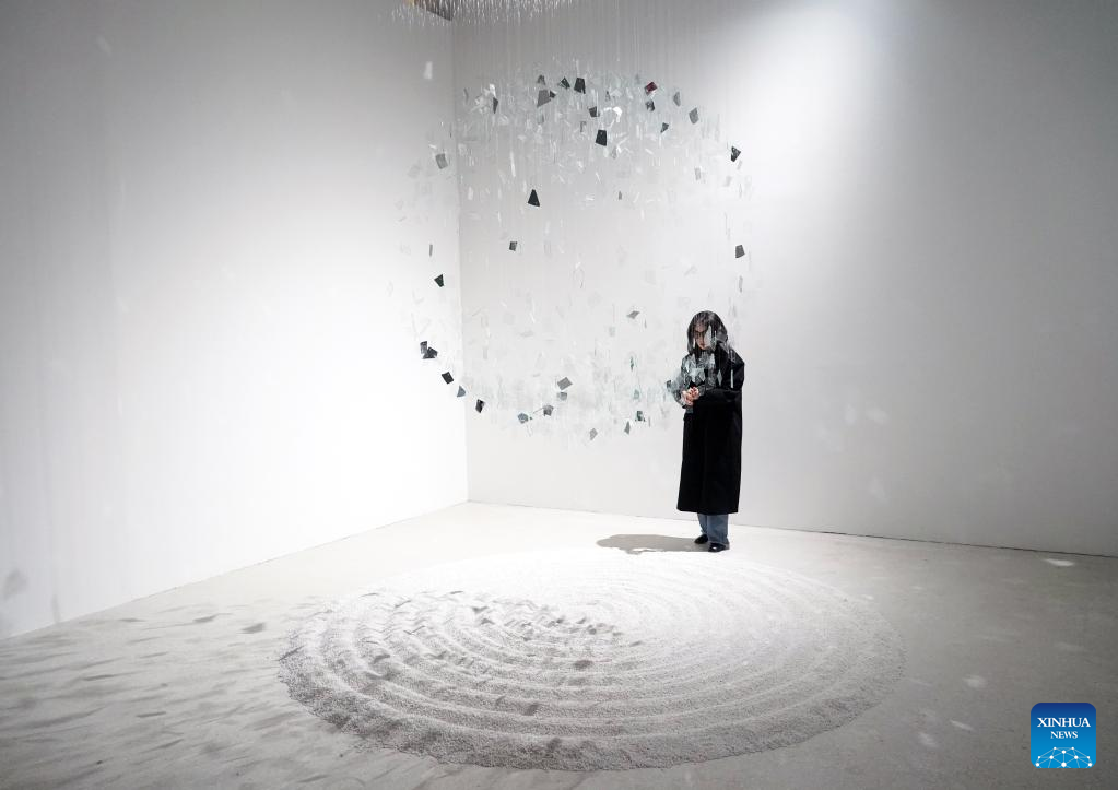 A tourist visits the contemporary art exhibition "WAVELENGTH: A Momentary Spring" at Beijing Times Art Museum in Beijing, capital of China, March 29, 2023. The event kicked off here on Wednesday, displaying contemporary art installations from 16 international artists. It will last until July 1. (Xinhua/Ren Chao)