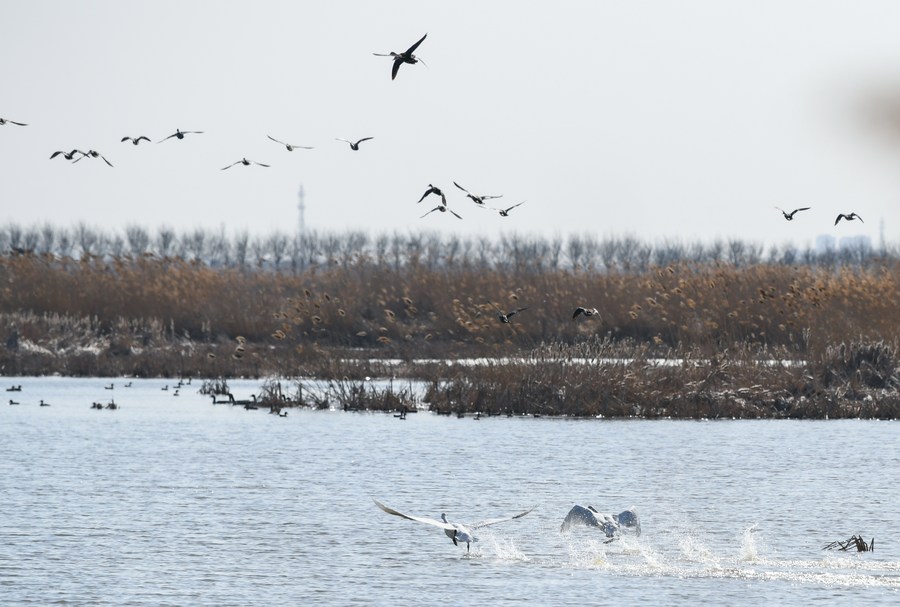 Migratory birds are seen in the Qilihai wetland nature reserve in Ninghe District of north China's Tianjin, March 2, 2022. (Xinhua/Sun Fanyue)