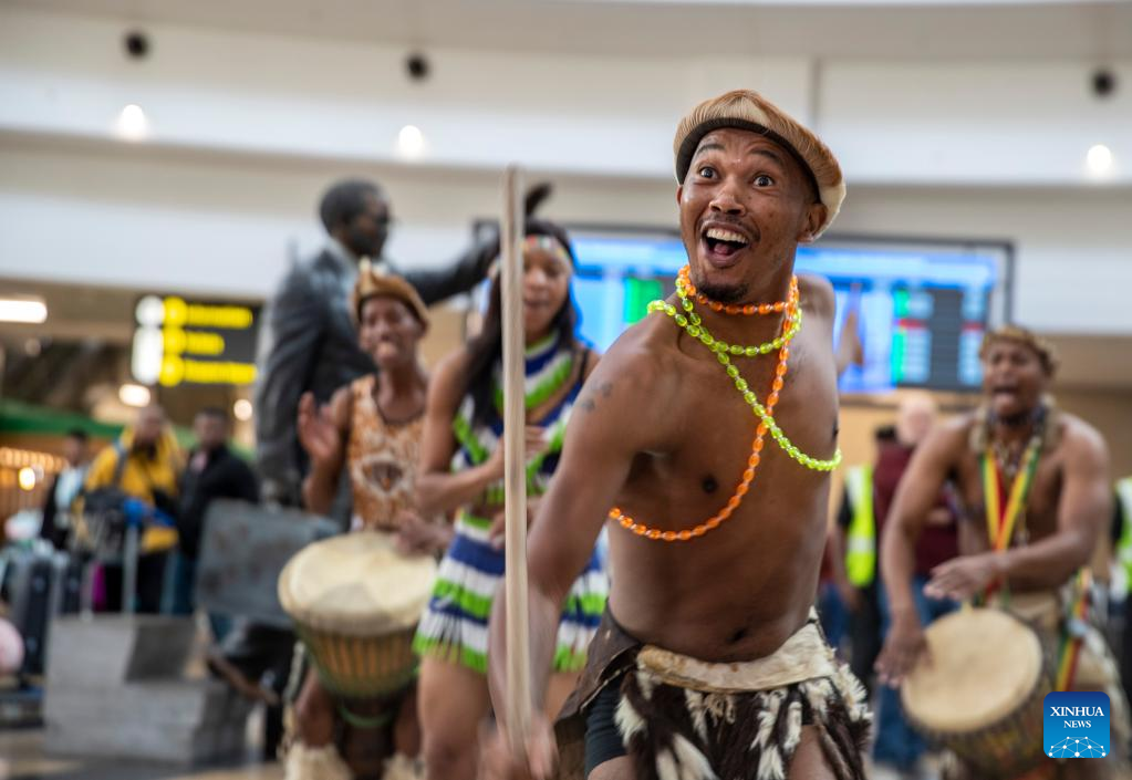 Dancers perform during a welcoming ceremony for tourists from China at the OR Tambo International Airport in Johannesburg, South Africa, on March 29, 2023. South Africa's tourism authority on Wednesday welcomed the first group of tourists from China since the outbreak of COVID-19. (Xinhua/Zhang Yudong)