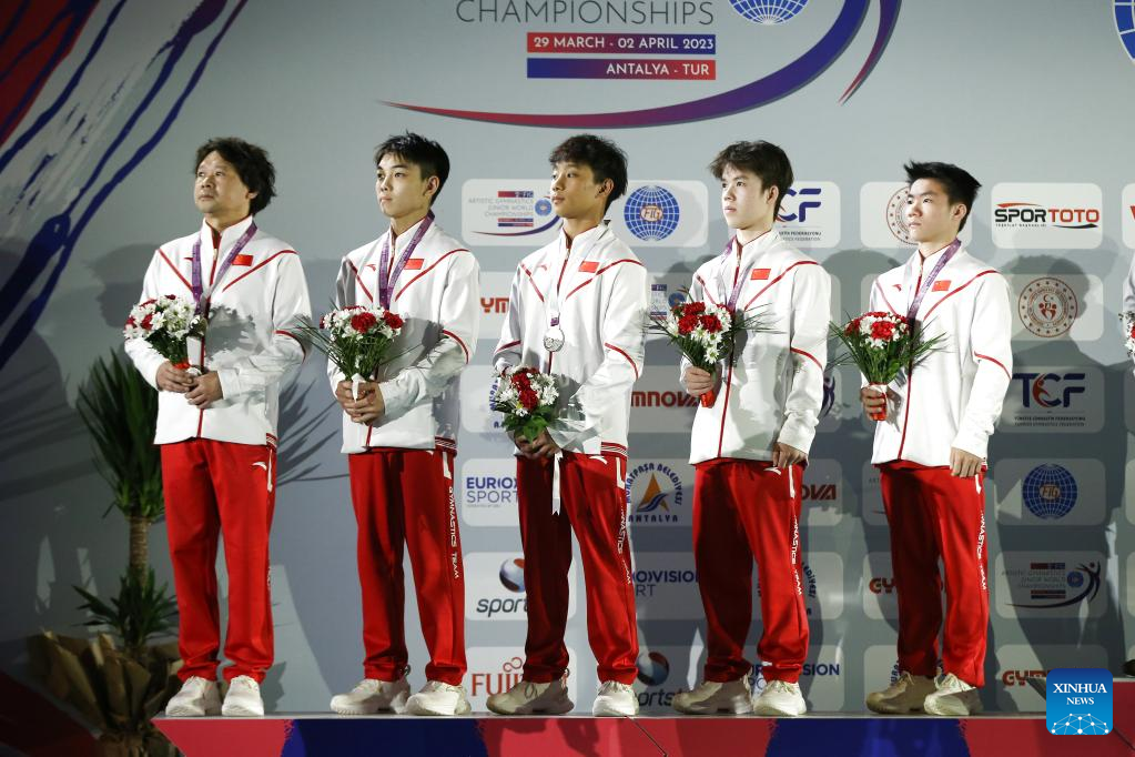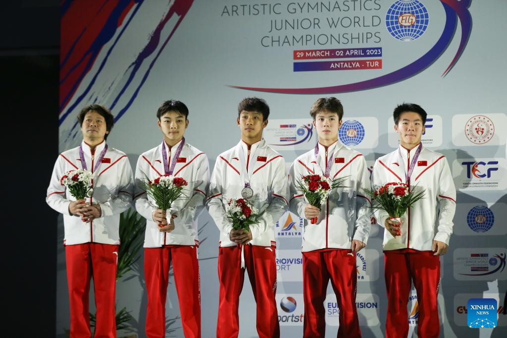 Silver medalists team China attend the awarding ceremony for the men's team final at the 2nd Artistic Gymnastics Junior World Championships in Antalya, Trkiye, on March 29, 2023. (Photo by Mustafa Kaya/Xinhua)