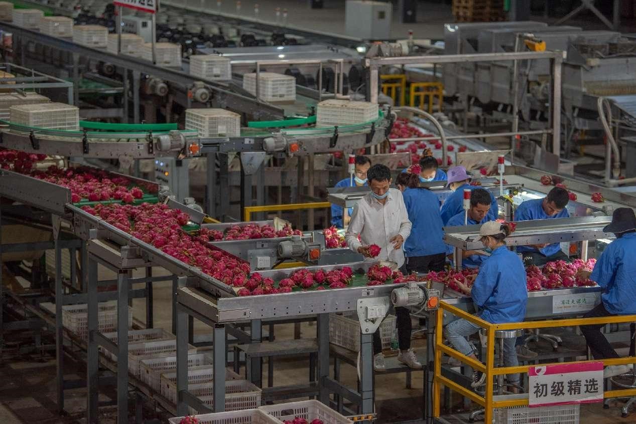 Workers sort and wrap pitaya at a factory in Dongfang city, south China’s Hainan province. The city has strived to build a pollution-free production base for tropical fruits and create a brand for green agricultural products. (People’s Daily Online/Yuan Chen)