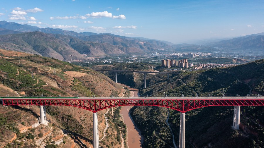 This aerial photo taken on Nov 23, 2022 shows a Fuxing bullet train running on the Yuanjiang bridge of the China-Laos Railway in southwest China's Yunnan Province. (Photo/Xinhua)