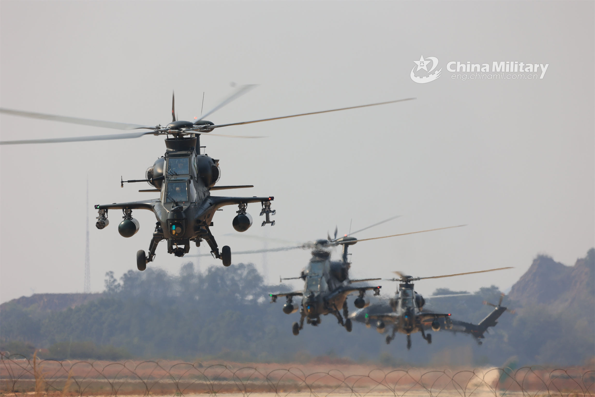 Helicopters attached to a brigade under the PLA 75th Group Army lift off for a recent formation flight training exercise. (eng.chinamil.com.cn/Photo by Sun Changyi)