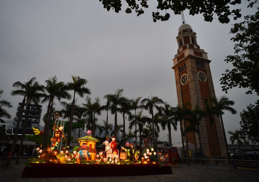 Colorful lanterns are lit up at Hong Kong Cultural Center Piazza to greet the upcoming Chinese Lantern Festival, south China, Feb. 17, 2016. (Xinhua/Ng Wing Kin)