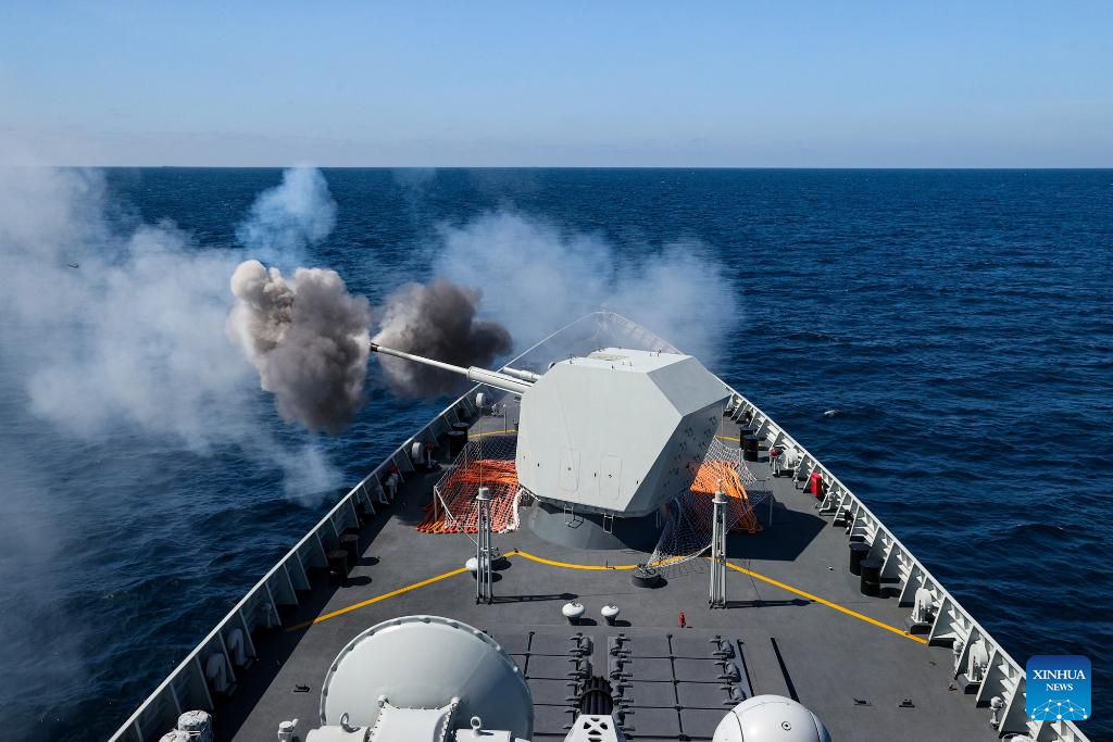 The missile destroyer Huainan bombards the sea during an actual combat training of the 42nd fleet of the Chinese People's Liberation Army Navy, on Feb. 6, 2023. A Chinese naval fleet returned to east China's port city of Qingdao in Shandong Province on Thursday after completing its mission of escorting civilian vessels in the Gulf of Aden and in the waters off Somalia. (Photo by Xu Taotao/Xinhua)