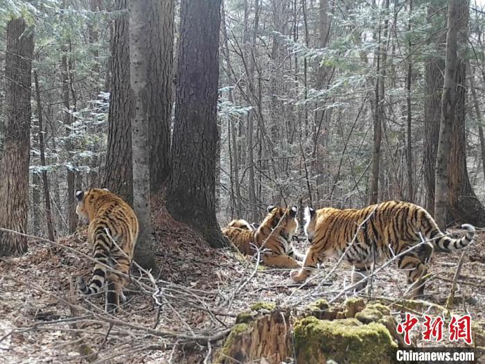 Photo shows three wild Siberian tigers in the Tianqiaoling forest area in northeast China’s Jilin Province. (Photo courtesy of Tianqiaoling Forestry Co., Ltd.)