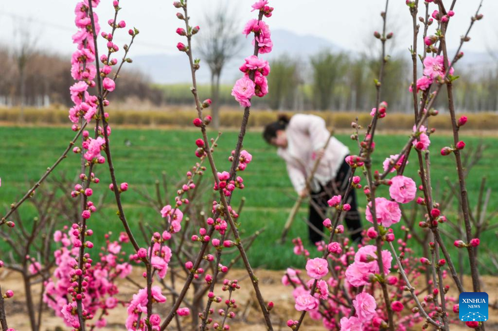 A farmer works in a wheat field at Xiweidian Village of Xindianzi Township, Zunhua City, north China's Hebei Province, April 4, 2023. Around the time of Qingming Festival which falls on April 5 this year, farmers across the country are busy with farm work.(Xinhua/Liu Mancang)