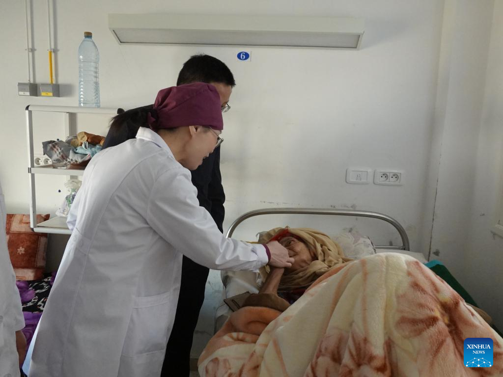 Anesthetist Peng Xihua checks the condition of a patient at Sidi Bouzid Regional Hospital in Sidi Bouzid, Tunisia, on Feb. 17, 2023. (Xinhua/Xu Supei)