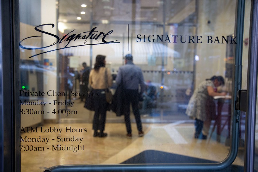 Customers wait inside a Signature Bank branch in New York, the United States, on March 13, 2023. (Photo by Michael Nagle/Xinhua)