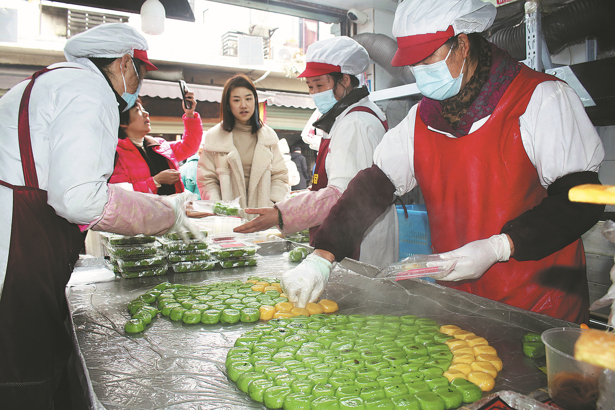 Consumers line up for qingtuan at a store in Suzhou, Jiangsu province, on Feb 8. WANG JIANKANG/FOR CHINA DAILY