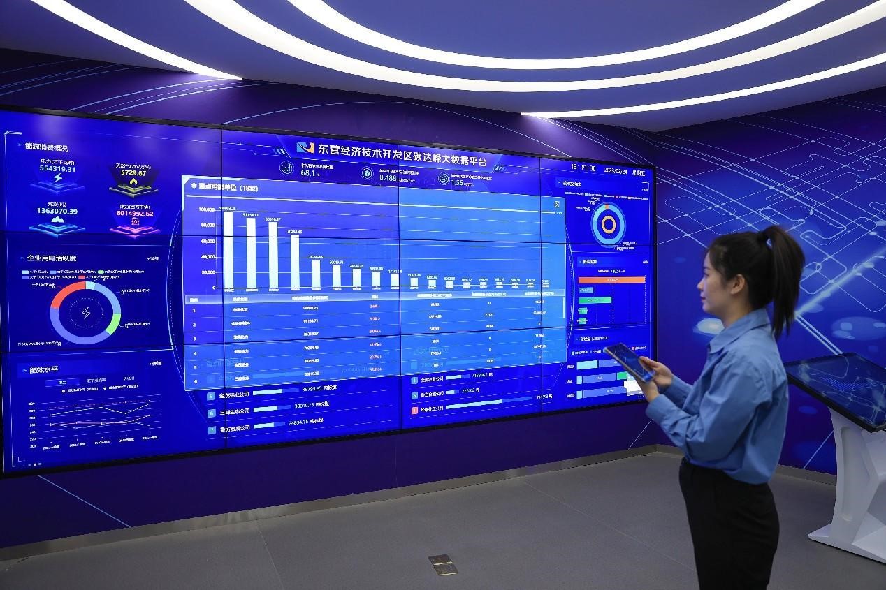 A staff member of an industrial internet innovation center in Dongying, east China's Shandong province, checks the real-time energy consumption of local enterprises on a big data platform. (People's Daily Online/Zhou Guangxue)