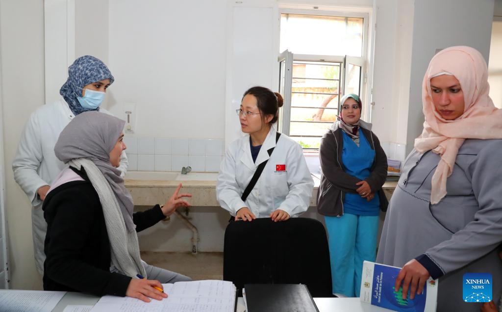Chinese doctor Zhou Long (3rd L) speaks with Moroccan medical workers at the Hassan II hospital in Settat, Morocco, on Feb. 27, 2023. For nearly half a century, Chinese doctors, mainly obstetrician-gynecologists, have earned a sterling reputation for their professionalism and dedication in some remote areas of Morocco. Many pregnant women from across the country come to seek medical advice and childbirth care from them. (Xinhua/Sui Xiankai)