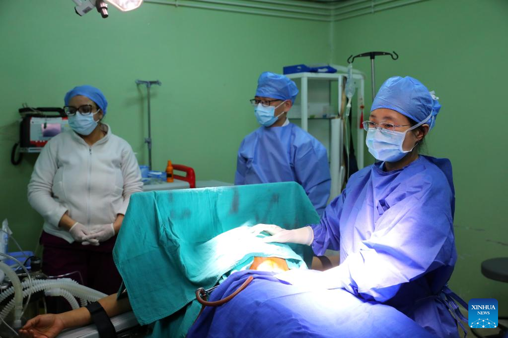 Chinese doctor Zhou Long (R) performs a cesarean at the Hassan II hospital in Settat, Morocco, on Feb. 27, 2023. For nearly half a century, Chinese doctors, mainly obstetrician-gynecologists, have earned a sterling reputation for their professionalism and dedication in some remote areas of Morocco. Many pregnant women from across the country come to seek medical advice and childbirth care from them. (Xinhua/Sui Xiankai)