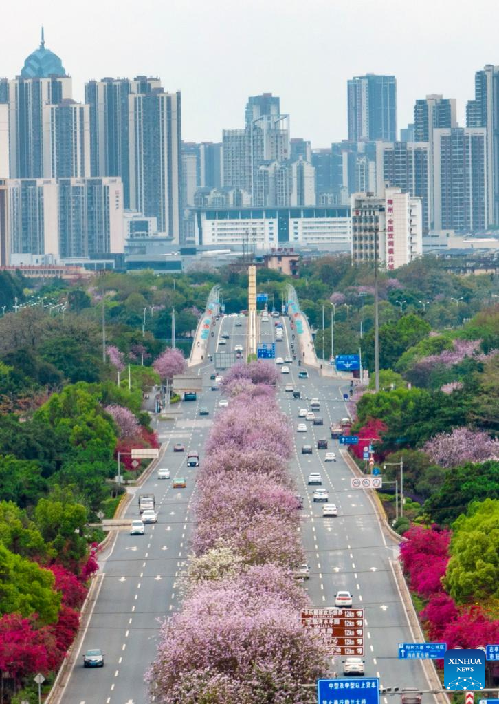 This aerial photo taken on April 5, 2023 shows cars running past Bauhinia blossoms in Liuzhou City, south China's Guangxi Zhuang Autonomous Region. (Photo by Li Hanchi/Xinhua)