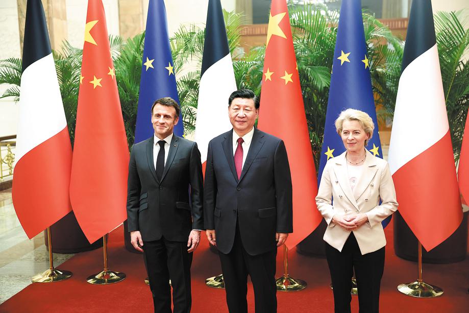 President Xi Jinping meets with French President Emmanuel Macron and European Commission President Ursula von der Leyen in the Great Hall of the People in Beijing on Thursday. Feng Yongbin / China Daily