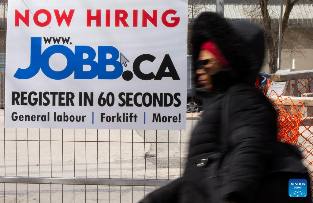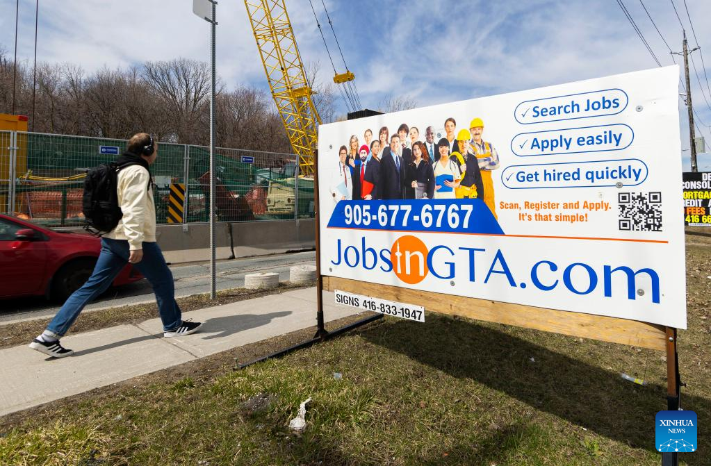 A man walks past a job board by a street in Toronto, Ontario, Canada, on April 6, 2023. Canada's employment grew by 35,000, or 0.2 percent, in March, following little change in February and strong growth in January and December, Statistics Canada said on Thursday. (Photo by Zou Zheng/Xinhua)
