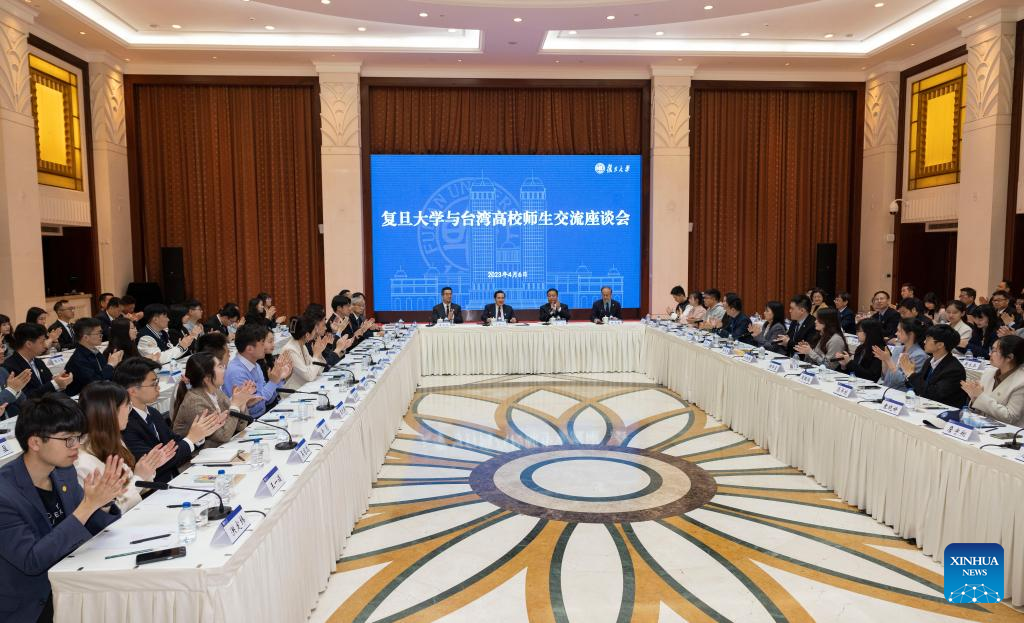 Taiwan students and students of Fudan University attend a group discussion at Fudan University in east China's Shanghai, April 6, 2023. Ma Ying-jeou, former chairman of the Chinese Kuomintang party, led a group of Taiwan students to Fudan University in Shanghai on Thursday morning. (Xinhua/Cai Yang)