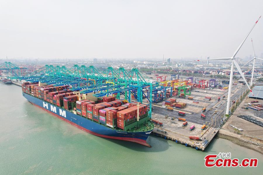 Drone photo shows a container ship loads containers at Tianjin Port, April 6, 2023. (Photo: China News Service/Tong Yu)