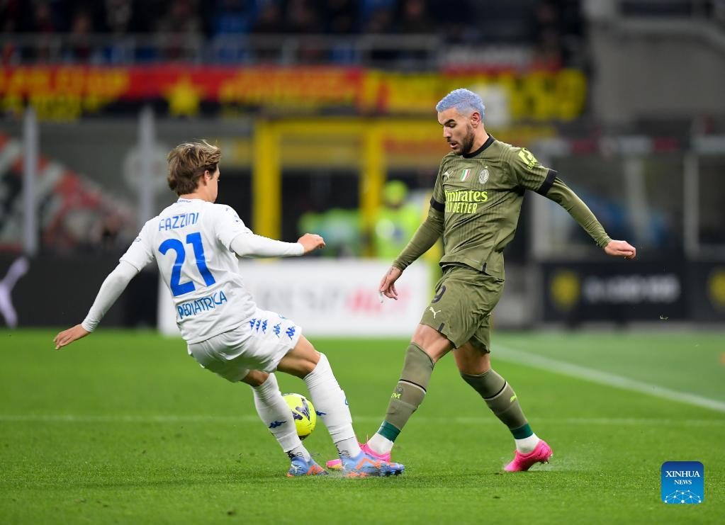 AC Milan's Theo Hernandez (R) vies with Empoli's Jacopo Fazzini during a Serie A football match between AC Milan and Empoli in Milan, Italy, on April 7, 2023. (Photo by Daniele Mascolo/Xinhua)