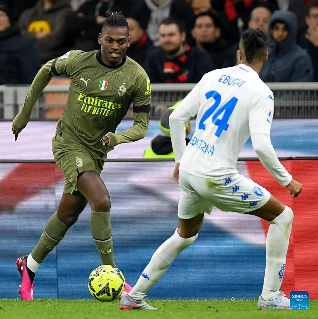 AC Milan's Rafael Leao (L) vies with Empoli's Tyronne Ebuehi during a Serie A football match between AC Milan and Empoli in Milan, Italy, on April 7, 2023. (Photo by Daniele Mascolo/Xinhua)
