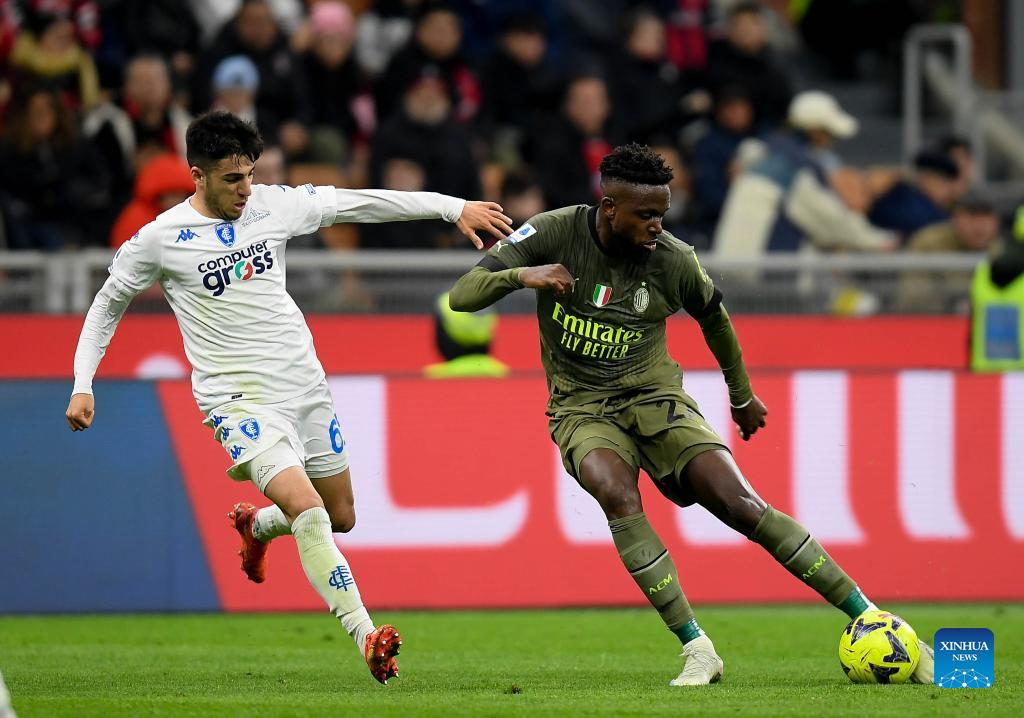 AC Milan's Theo Hernandez (R) vies with Empoli's Tyronne Ebuehi during a Serie A football match between AC Milan and Empoli in Milan, Italy, on April 7, 2023. (Photo by Daniele Mascolo/Xinhua)