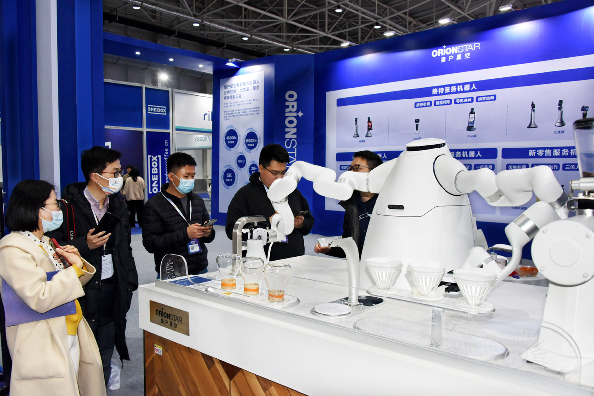 A robot makes drinks for visitors at the 2023 Qingdao Digital Culture Application Development Expo in Qingdao, Shandong province, on April 6, 2023. [Photo/Xinhua]