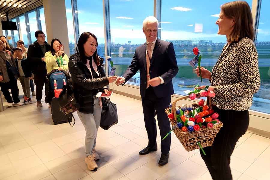 Airport representatives give away Dutch souvenirs — painted wooden tulips — to Chinese tourists at Amsterdam's Schiphol Airport in the Netherlands on March 26. [PHOTO by WANG XIANGJIANG/XINHUA]