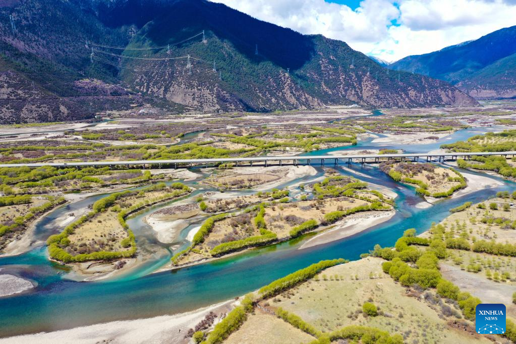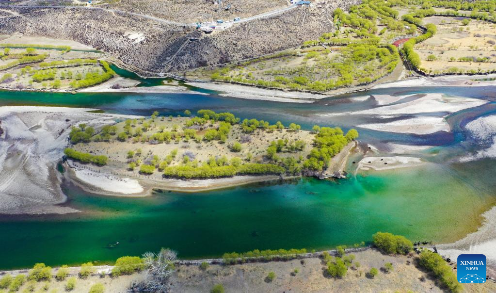 This aerial photo taken on April 7, 2023 shows the spring scenery at Yani national wetland park in Nyingchi, southwest China's Tibet Autonomous Region. (Xinhua/Nie Yi)