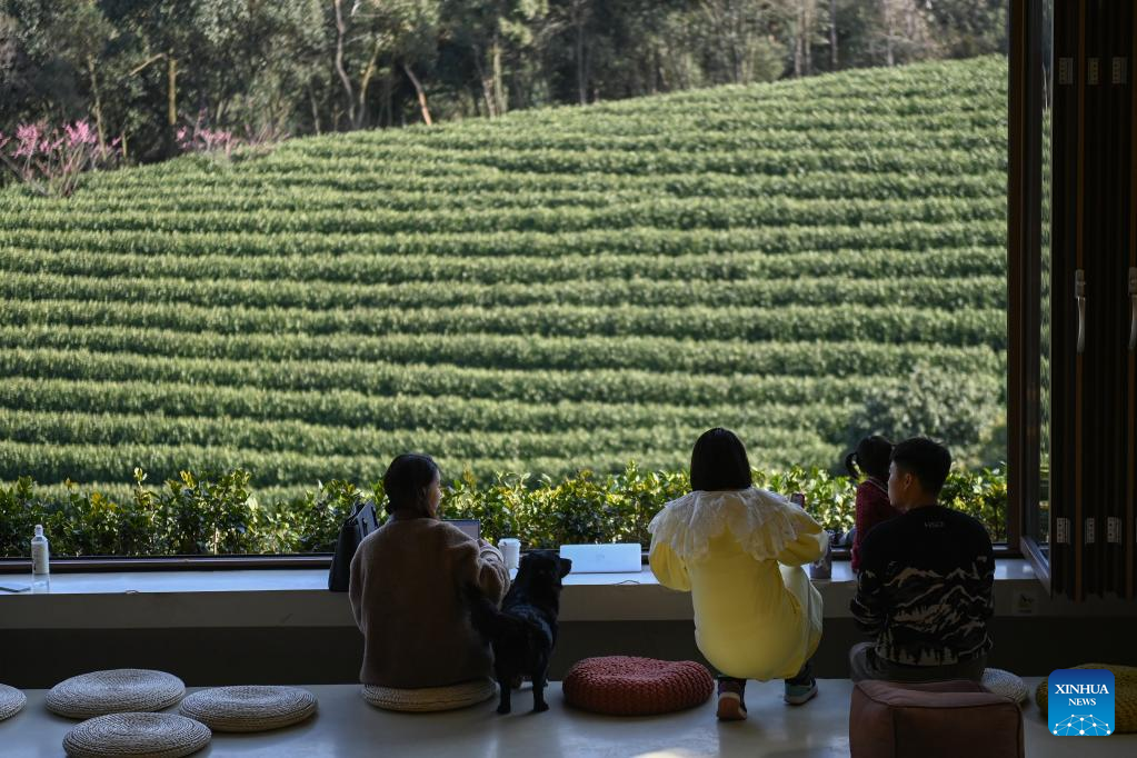 Tourists enjoy their time at a cafe beside a tea garden in Huangdu Village of Huzhou City, east China's Zhejiang Province, Feb. 21, 2023. In June 2003, Zhejiang Province launched the "Thousand Villages Demonstration and Ten Thousand Villages Renovation" project, with the aim of comprehensively renovating ten thousand administrative villages in the province and building a thousand key villages of them into all-round well-off model villages. For twenty years, the project has created thousands of beautiful villages, and fundamentally changed the face of the province's countryside. (Xinhua/Huang Zongzhi)