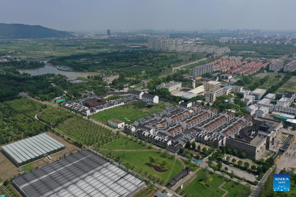 This aerial photo taken on Oct. 13, 2022 shows a view of a village adjacent to the Taihu Lake in Wuxing District of Huzhou City, east China's Zhejiang Province. In June 2003, Zhejiang Province launched the "Thousand Villages Demonstration and Ten Thousand Villages Renovation" project, with the aim of comprehensively renovating ten thousand administrative villages in the province and building a thousand key villages of them into all-round well-off model villages. For twenty years, the project has created thousands of beautiful villages, and fundamentally changed the face of the province's countryside. (Xinhua/Huang Zongzhi)