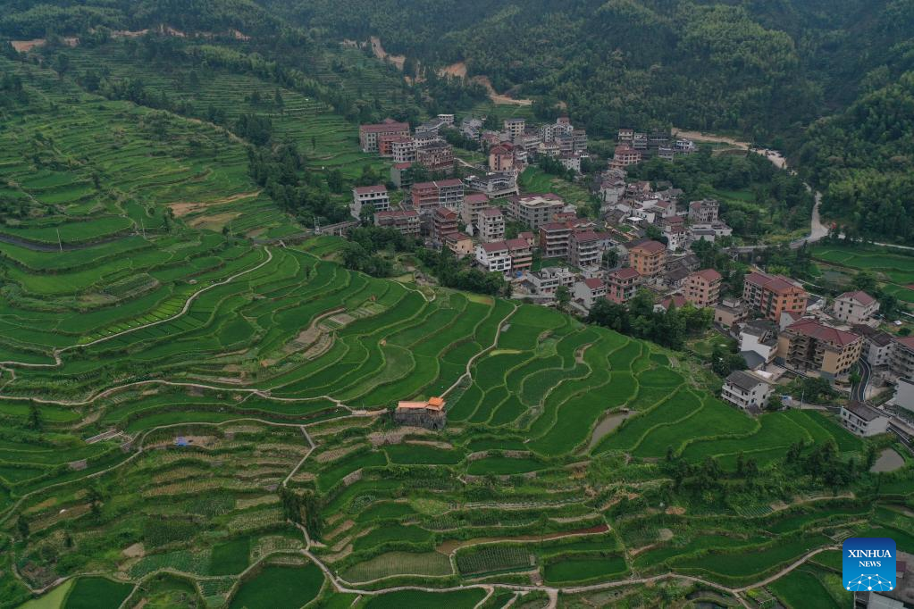 This aerial photo taken on July 18, 2022 shows a view of Longxian Village of Lishui City, east China's Zhejiang Province. In June 2003, Zhejiang Province launched the "Thousand Villages Demonstration and Ten Thousand Villages Renovation" project, with the aim of comprehensively renovating ten thousand administrative villages in the province and building a thousand key villages of them into all-round well-off model villages. For twenty years, the project has created thousands of beautiful villages, and fundamentally changed the face of the province's countryside. (Xinhua/Huang Zongzhi)