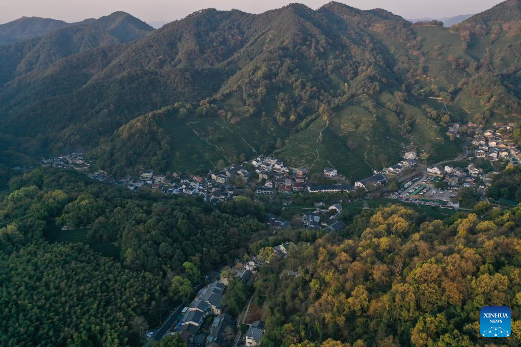 This aerial photo taken on March 15, 2023 shows a view of Longjing Village of Hangzhou City, east China's Zhejiang Province. In June 2003, Zhejiang Province launched the "Thousand Villages Demonstration and Ten Thousand Villages Renovation" project, with the aim of comprehensively renovating ten thousand administrative villages in the province and building a thousand key villages of them into all-round well-off model villages. For twenty years, the project has created thousands of beautiful villages, and fundamentally changed the face of the province's countryside. (Xinhua/Huang Zongzhi)
