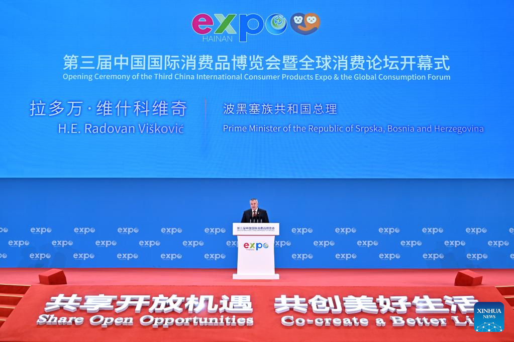 Radovan Viskovic, prime minister of the Republic of Srpska (RS), Bosnia and Herzegovina's (BiH), addresses the opening ceremony of the third China International Consumer Products Expo (CICPE) in Haikou, capital city of south China's Hainan Province, April 10, 2023. More than 3,300 high-quality brands from home and abroad have gathered at the third CICPE, which kicked off Monday in Haikou. (Xinhua/Li Xin)