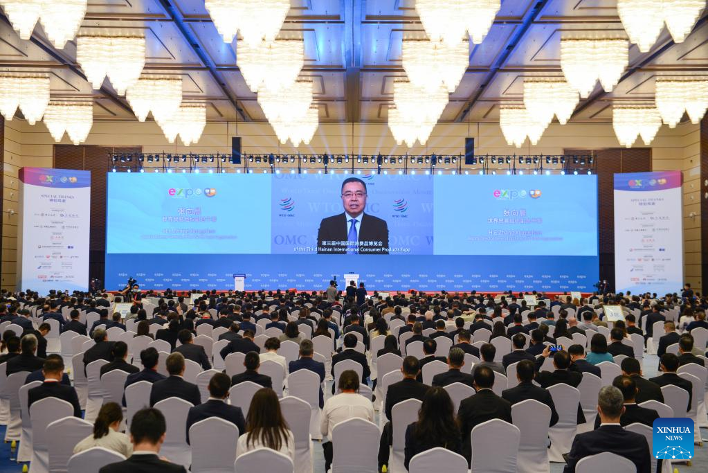 Zhang Xiangchen, deputy director-general of the World Trade Organization, makes a video speech at the opening ceremony of the third China International Consumer Products Expo (CICPE) in Haikou, capital city of south China's Hainan Province, April 10, 2023. More than 3,300 high-quality brands from home and abroad have gathered at the third CICPE, which kicked off Monday in Haikou. (Xinhua/Wang Zecong)