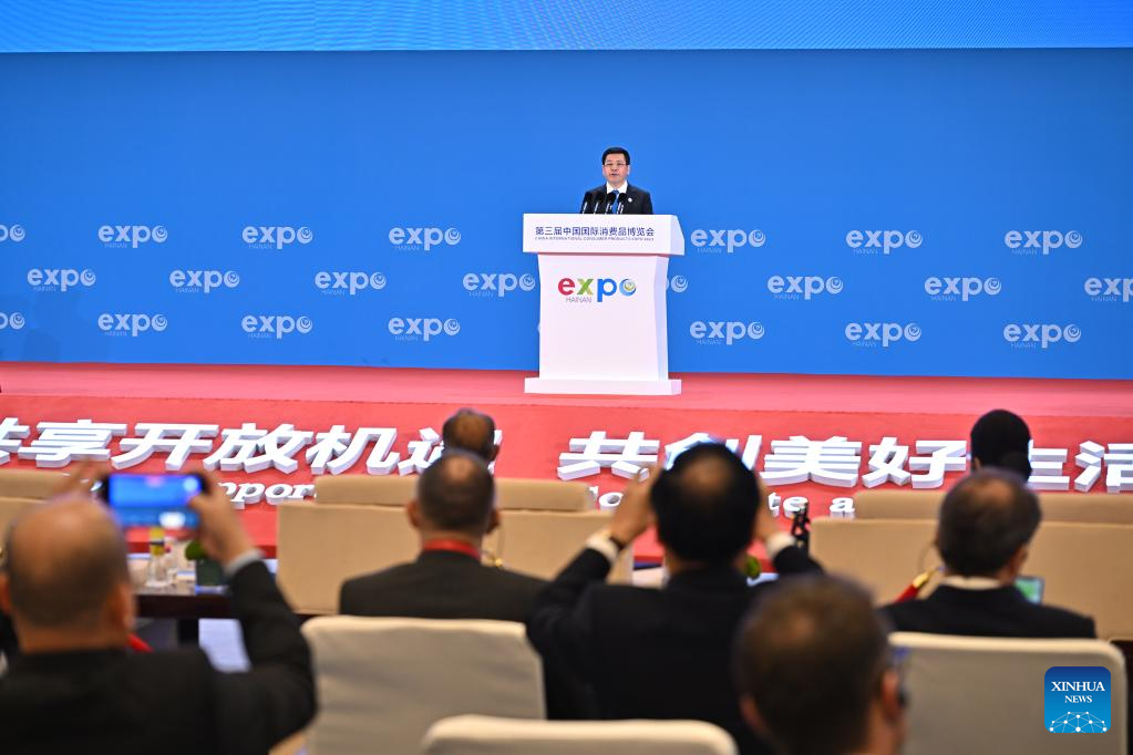 Nguyen Hong Dien, Vietnam's minister of industry and trade, addresses the opening ceremony of the third China International Consumer Products Expo (CICPE) in Haikou, capital city of south China's Hainan Province, April 10, 2023. More than 3,300 high-quality brands from home and abroad have gathered at the third CICPE, which kicked off Monday in Haikou. (Xinhua/Li Xin)